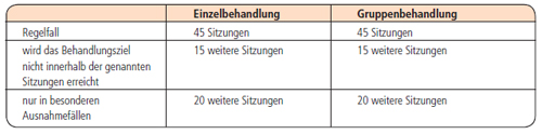 1. verbale Intervention als Einzelbehandlung mit bis zu 25 Sitzungen, sowohl über einen kürzeren Zeitraum als auch im Verlauf chronischer Erkrankungen über einen längeren Zeitraum in niederfrequenter Form,
