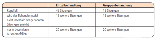 1. verbale Intervention als Einzelbehandlung mit bis zu 25 Sitzungen, sowohl über einen kürzeren Zeitraum als auch im Verlauf chronischer Erkrankungen über einen längeren Zeitraum in niederfrequenter Form,
